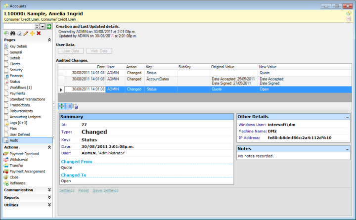 Additionally, many finance companies require external parties, eg Dealers, to have the ability to create both clients and the loan application, but within strict limitations of what they can and cannot do. The example dealer module below allows them to see all clients, but only their own loans. Contracts are created as a pdf document. Currently we are enhancing this module to provide a turnkey process flow management system to enable all the required steps prior to approval to be recorded and monitored by the dealers themselves, thus reducing the administrative time of the back office staff.